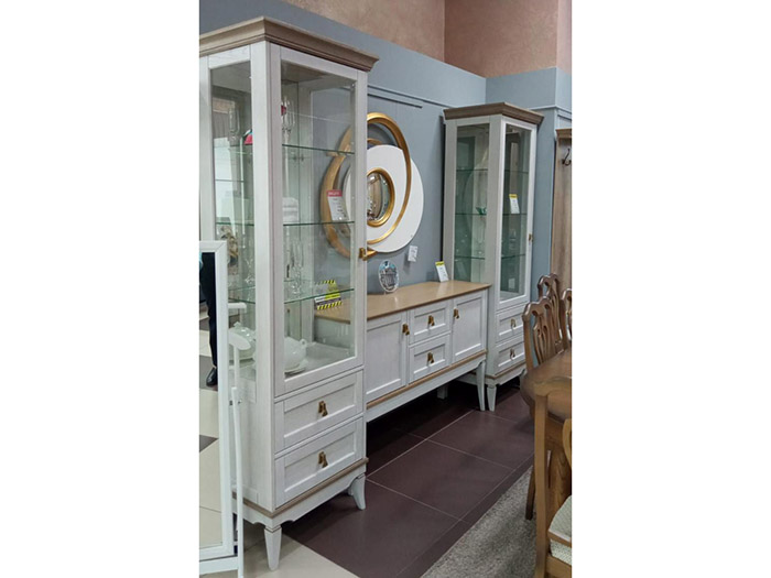 В состав гостиной входят тумба и два шкафа с витриной со стеклом. Массив и шпон дуба.