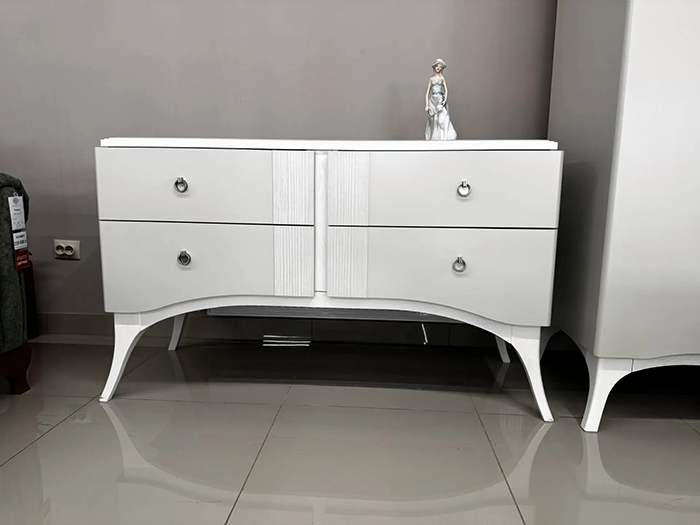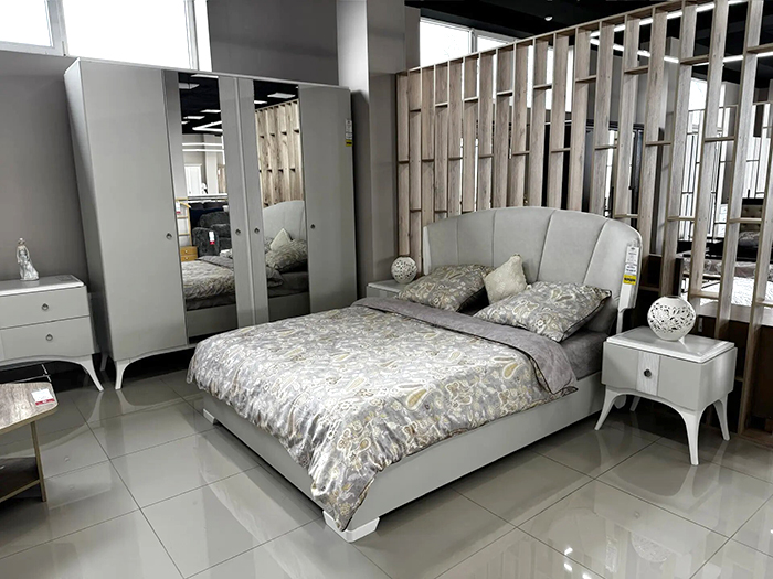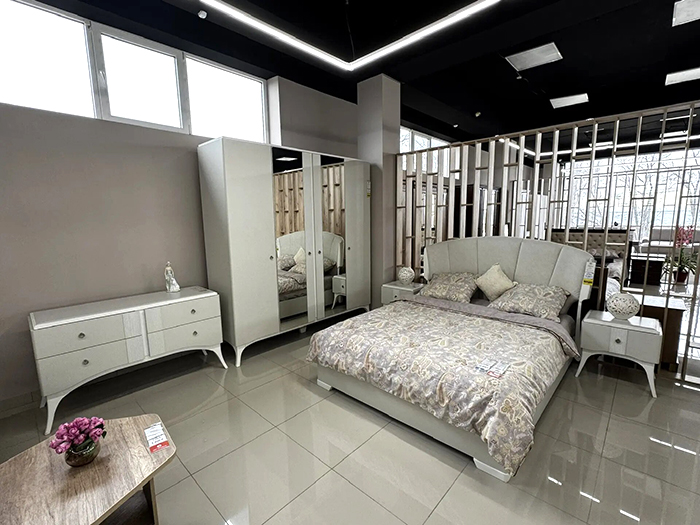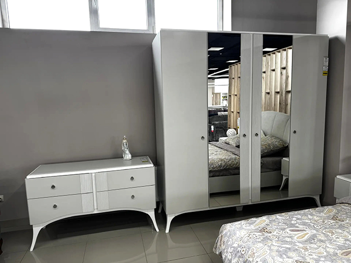В набор входят кровать со спальным местом 2000х1600 мм, две тумбочки, комод и огромный четырёхдверный шкаф с полноростовыми зеркалами. Ламельное основание и матрас в набор не входят, их следует приобретать отдельно.