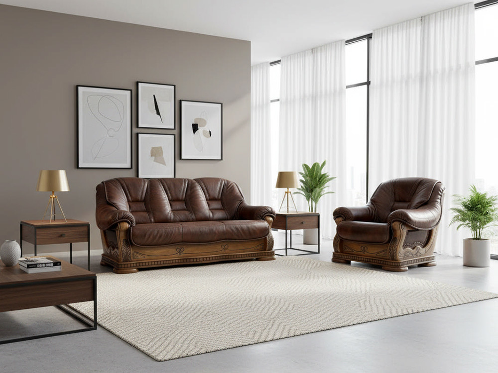 Для изготовления мягкой мебели «Милан» используется кожа производства Италии и России. По цвету, мебельные кожи подразделяют: черные, цветные, многоцветные, матовые и блестящие с нанесением прозрачной лаковой эмульсии. В качестве наполнителя и формообразующего материала для мягких элементов сидения и спинки (спинка с подлокотниками изготавливается одним чехлом) в данных наборах применяется: ППУ (пенополиуретан) разной плотности и типоразмеров ( в зависимости от места его расположения в изделии, т.е. сидение, спинка, подлокотник). Синтепон применяется как настилочный материал, используемый в качестве пружинящей прослойки между покровным обивочным материалом и основным формообразующим материалом, которым для данного изделия является поролон. Каркасы мебели «Милан» выполнены из массива дуба и плиты ( МДФ, облицованной шпоном дуба). В креслах и диванах нераскладываемых под мягкие элементы сидения крепится ортопедическая решетка. Опоры передние изготовлены из массива древесины лиственных пород. Сочетание натуральных материалов, массива дерева и натуральной кожи, говорит об исключительном вкусе и респектабельности хозяина, а оригинальное исполнение каркаса из массива дуба с элементами резьбы сделает ваш интерьер неповторимым.