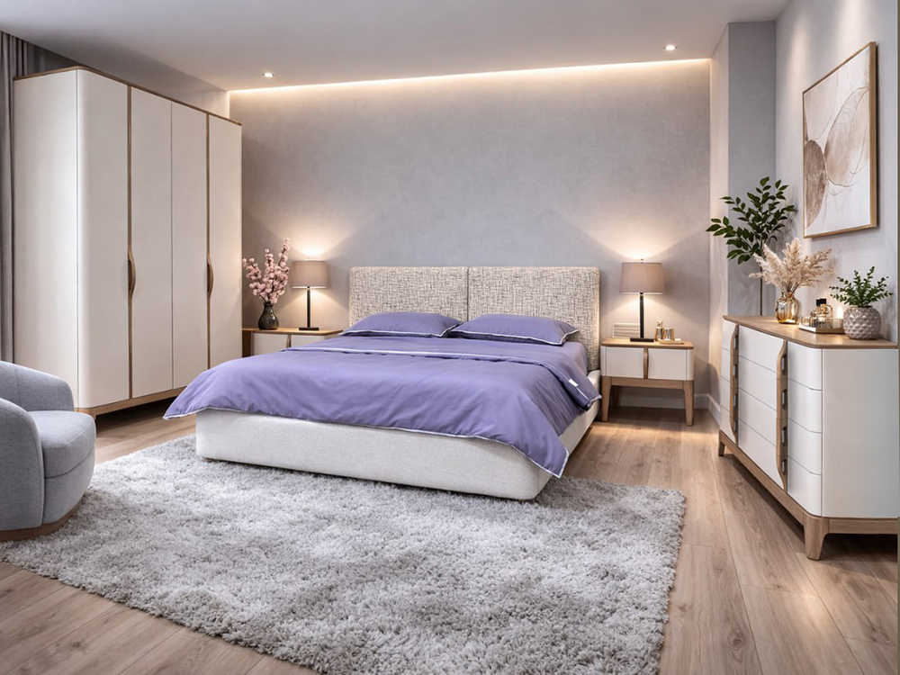 Набор мебели для спальни «САТИ». Каркас и фасады изготовлены из ЛДСП и МДФ. Опоры из массива. Крашение — «персидский жемчуг».