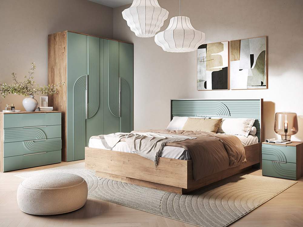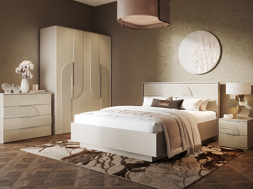 Каркас выполнен из ЛДСП, фасады из МДФ, использована качественная фурнитура. Модульная система даёт возможность компоновки спальни под размеры комнаты. К кровати подходит матраc размером 2000х1600 мм. (Приобретается отдельно)