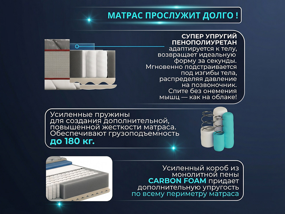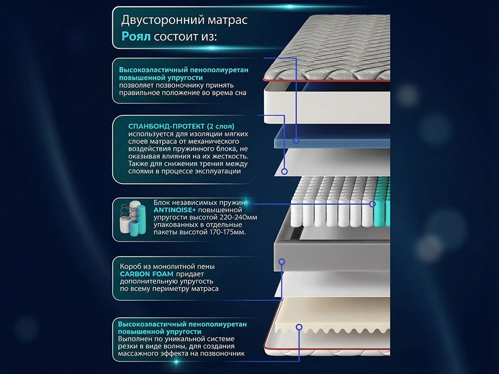 | Наполнитель (слои): | Пена упругая → НБП ANTINOISE+ (220–240мм) → Пена массажная |
