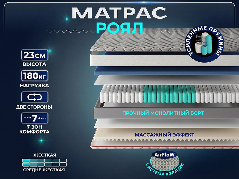 Матрас AMI Роял – двусторонний ортопедический матрас на независимом пружинном блоке Antinoise с разной жёсткостью сторон. Жёсткая сторона с кокосовой койрой и натуральным латексом обеспечивает плотную поддержку позвоночника и хорошо подходит тем, кто предпочитает твёрдое спальное место или имеет повышенный вес. Среднежёсткая сторона из высокоэластичного пенополиуретана делает спальное место более комфортным, снижает давление на плечи и бёдра и подойдёт тем, кому нужна упругая, но не «доскообразная» поверхность. Независимые пружины работают точечно, практически не передают колебания и помогают сохранить естественное положение позвоночника во время сна. Конструкция выдерживает высокую ежедневную нагрузку и подходит для большинства стандартных оснований кроватей. Съёмный стёганый чехол «зима‑лето» из полиэстера/микрофибры с гипоаллергенным наполнителем и подкладкой из спанбонда остаётся приятным на ощупь, улучшает воздухообмен и упрощает уход за матрасом.