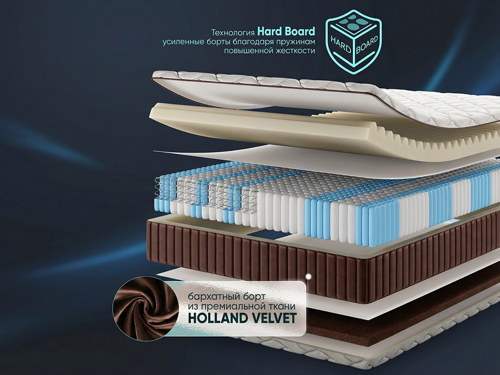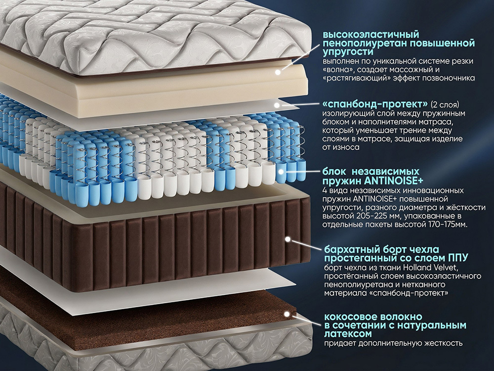 | Наполнитель (слои): | Пена массажная (25мм) → НБП ANTINOISE+ (205–225мм) → Кокос латексированный |