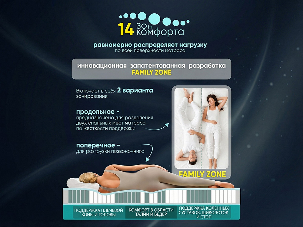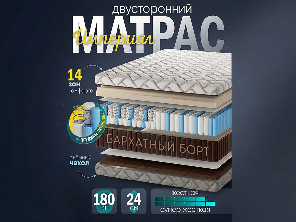 Матрас AMI Империал – жёсткий матрас с ортопедическим эффектом для ежедневного сна с запатентованной системой зонирования Family Zone. Независимый пружинный блок Antinoise+ с 14 зонами комфорта и двойным зонированием распределяет нагрузку по всему телу, снимает напряжение с позвоночника и помогает мышцам полностью расслабиться. Продольные зоны разделяют двуспальное место по жёсткости, поэтому каждому комфортно даже при разном весе и привычках сна. С одной стороны расположен слой кокосовой койры с натуральным латексом – эта сторона даёт по‑настоящему жёсткую, упругую поддержку и хорошо подходит для любителей твёрдых матрасов, людей с повышенным весом и подростков в период активного роста. Обратная сторона выполнена из высокоэластичного пенополиуретана, нарезанного волной: рельефный слой создаёт мягкий массажный эффект, улучшает кровообращение и делает посадку и перевороты во сне более комфортными. Четырёхслойный стёганый чехол из микрофибры с антиаллергенным наполнителем, слоем ППУ и спанбондом остаётся приятным на ощупь, хорошо «дышит» и поддерживает оптимальную температуру в любое время года. Усиленный периметр по технологии Hard Board защищает края от проседания и сохраняет форму матраса даже при высокой ежедневной нагрузке. Высота около 24 см и допустимая нагрузка до 180 кг на спальное место делают Империал универсальным решением как для стандартных двуспальных кроватей, так и для семейных спален с интенсивной эксплуатацией.