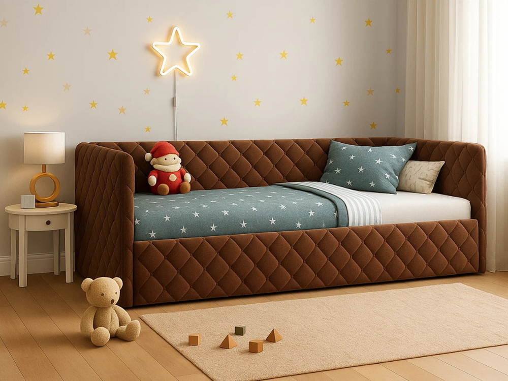 Оригинальная модель кровати, которая несомненно станет стильным украшением и эргономичным элементом детской комнаты. Кровать c тщательно продуманной конструкцией гарантирует здоровый сон и полноценный отдых. Мягкие боковины и задняя стенка этой кровати полностью исключают возможность травмирования, поэтому эта кровать безопасна для детей. Обивочная ткань мягкая и приятная на ощупь, а декоративная прострочка в виде ромбов служит оригинальным украшением. Конструкция кровати предусматривает наличие подъемного механизма, который легко открывается, предоставляя доступ к просторному коробу для белья, разделенному на ниши для удобного хранения. Использование в производстве качественных проверенных материалов и износостойкой обивки гарантируют изделию долгий срок службы и привлекательный внешний вид.