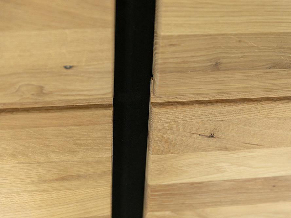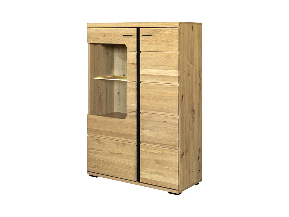 Надежность и исполнение: Основа из ламинированного ДСП устойчива к механическим нагрузкам и проста в уходе. Матовые фасады из массива дуба демонстрируют выраженную текстуру дерева, дополненную контрастной вертикальной вставкой и лаконичными черными ручками. Геометрия модели отличается строгими прямыми линиями и скругленным вырезом открытой ниши.