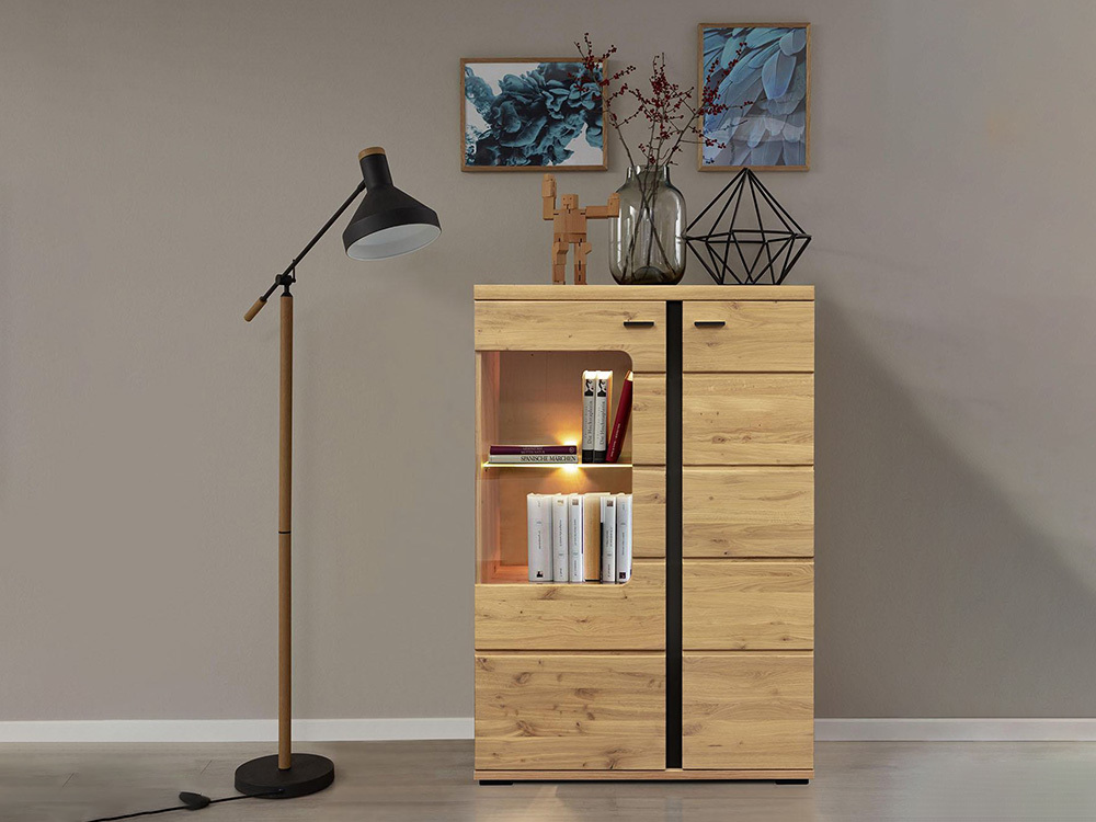 Эстетика: Натуральный оттенок дуба придает интерьеру теплоту, а темный декоративный элемент добавляет графичности. Модель сочетается с другими элементами коллекции СОНОС СИТИ. Подходит для ценителей функциональных систем хранения с использованием натуральных материалов.