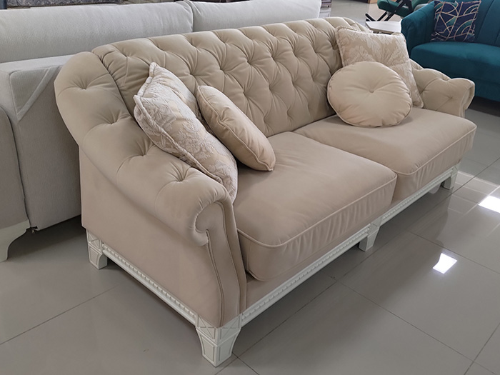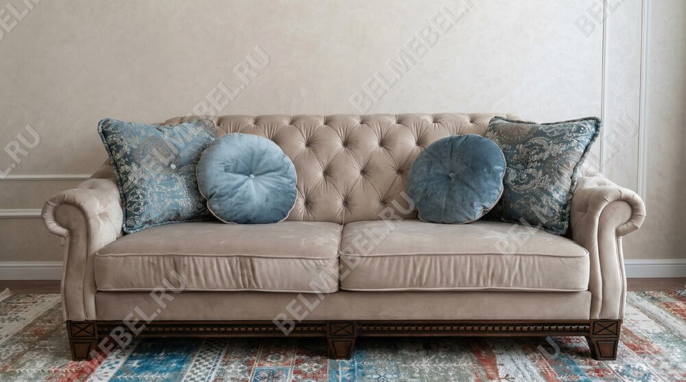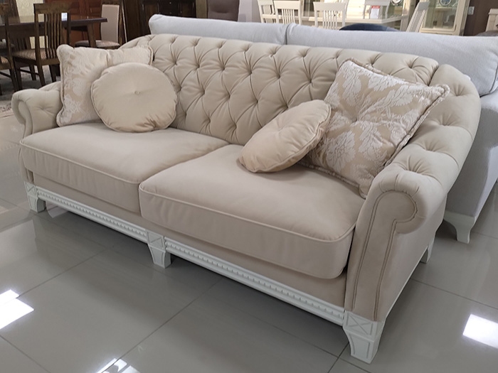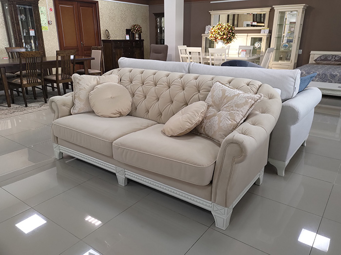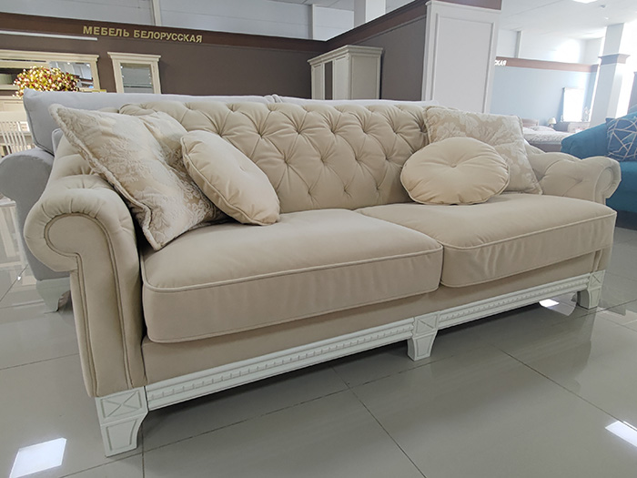 Стильный классический диван с каретной стяжкой, на резных опорах из массива древесины. Имеет механизм трансформации, превращающий его в полноценное, комфортное спальное место.