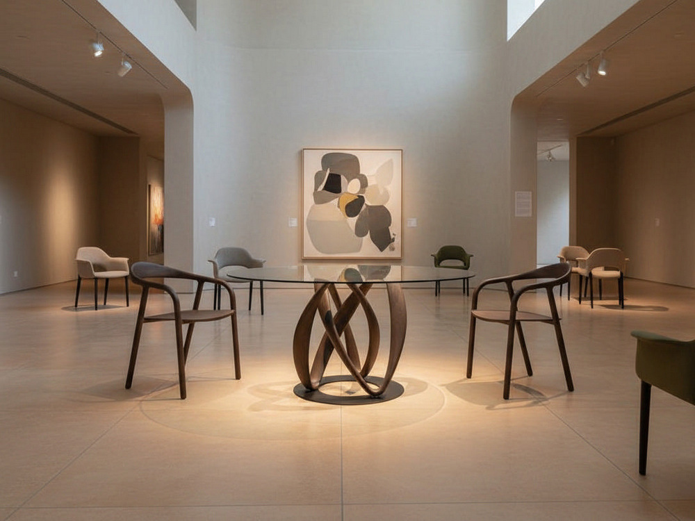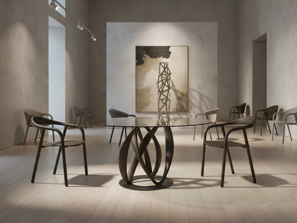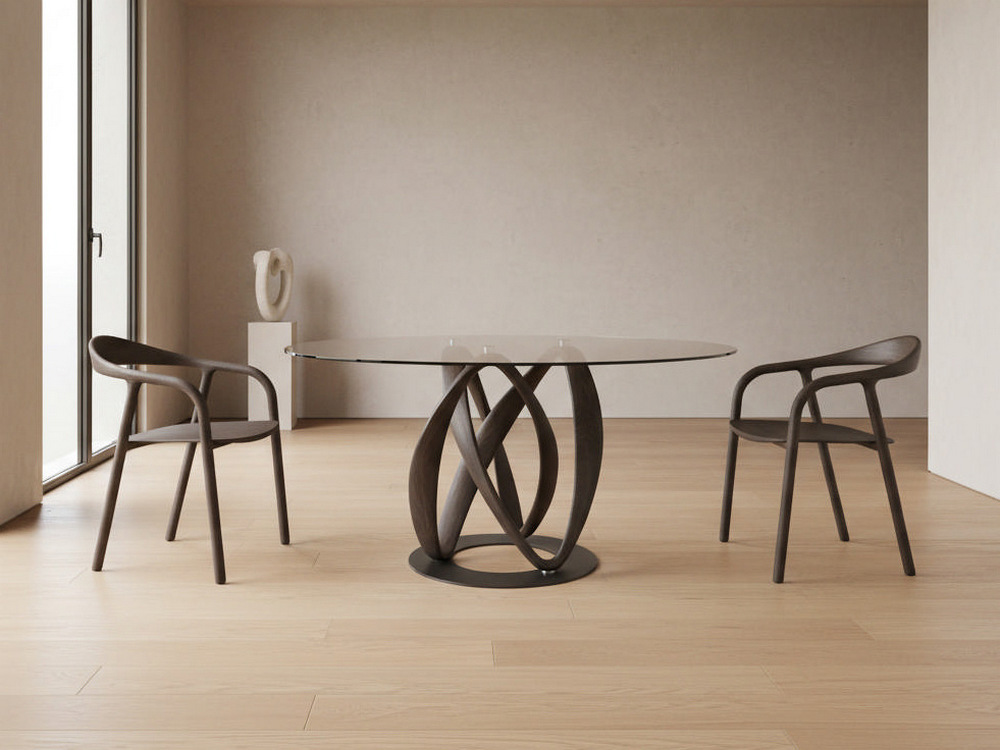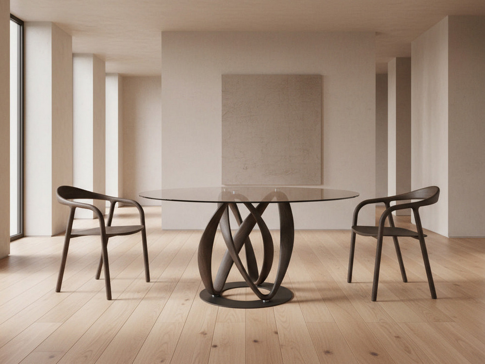 Элегантный обеденный стол с ярким дизайном. Опоры изготовлены из клееного массива дуба, столешница из калёного стекла, толщиной 8 мм.