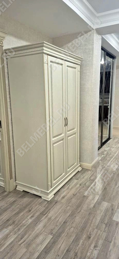 Пилястры и карниз украшены узнаваемыми для коллекции "Верди" резными элементами. Шкаф для одежды и белья оборудован штангой для вешалок и антресольной полкой. Опоры изготовлены из массива, что исключает набухание от случайно пролитой влаги.