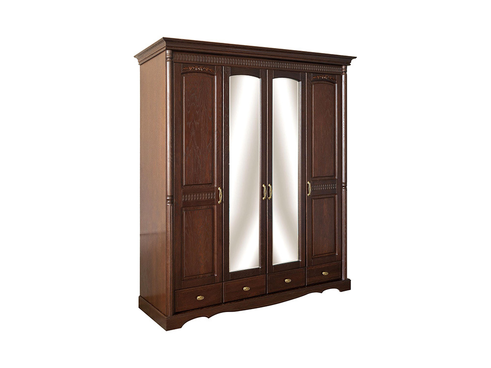 Пилястры и карниз украшены узнаваемыми для коллекции "Верди" резными элементами. Шкаф для одежды и белья оборудован штангой для вешалок и антресольной полкой. Опоры изготовлены из массива, что исключает набухание от случайно пролитой влаги.