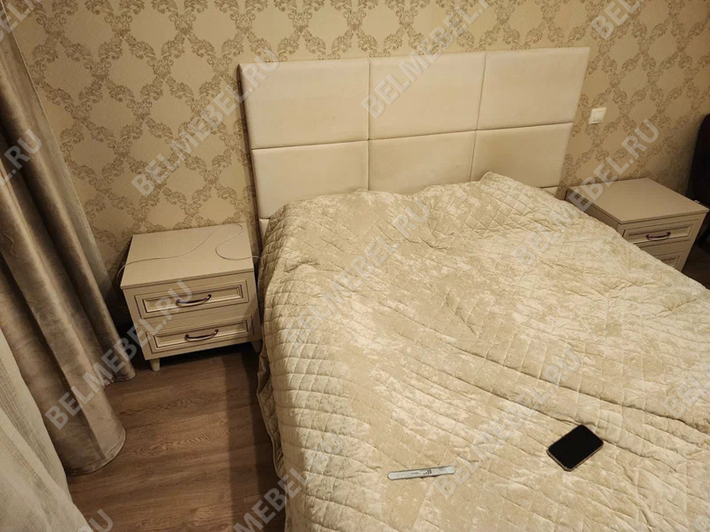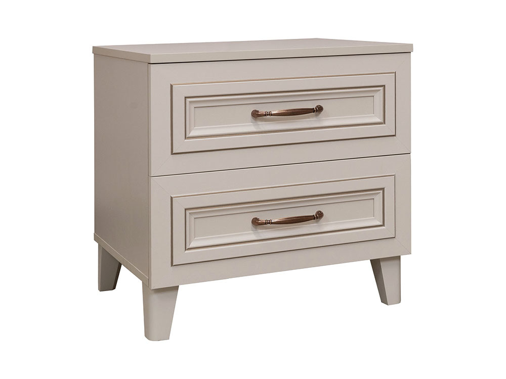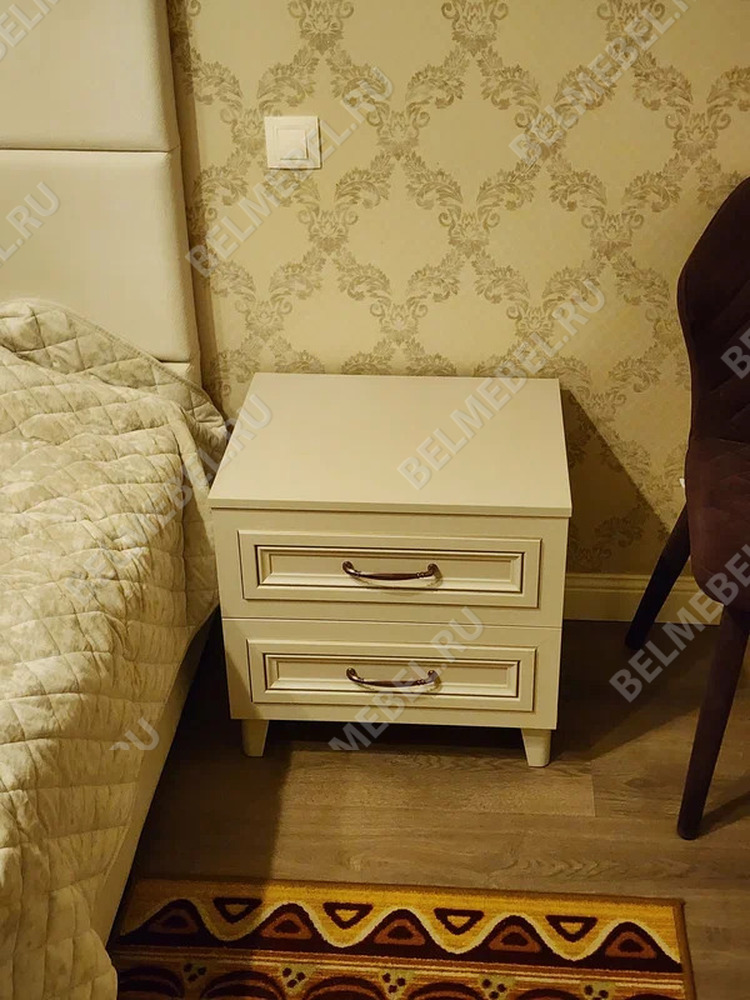 Прикроватная тумба из коллекции мебели «САТИ». Каркас и фасады изготовлены из ЛДСП и МДФ. Опоры из массива. Крашение — «персидский жемчуг».