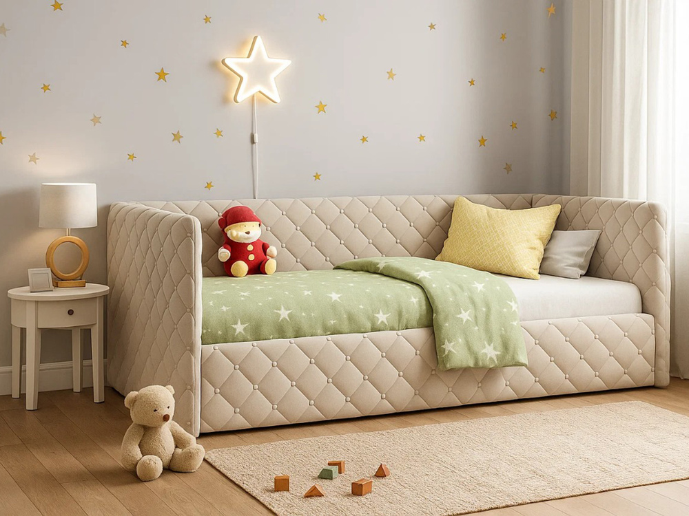 Оригинальная модель кровати, которая несомненно станет стильным украшением и эргономичным элементом детской комнаты. Кровать c тщательно продуманной конструкцией гарантирует здоровый сон и полноценный отдых. Мягкие боковины и задняя стенка этой кровати полностью исключают возможность травмирования, поэтому эта кровать безопасна для детей. Обивочная ткань мягкая и приятная на ощупь, а декоративная прострочка в виде ромбов служит оригинальным украшением. Конструкция кровати предусматривает наличие подъемного механизма, который легко открывается, предоставляя доступ к просторному коробу для белья, разделенному на ниши для удобного хранения. Использование в производстве качественных проверенных материалов и износостойкой обивки гарантируют изделию долгий срок службы и привлекательный внешний вид.