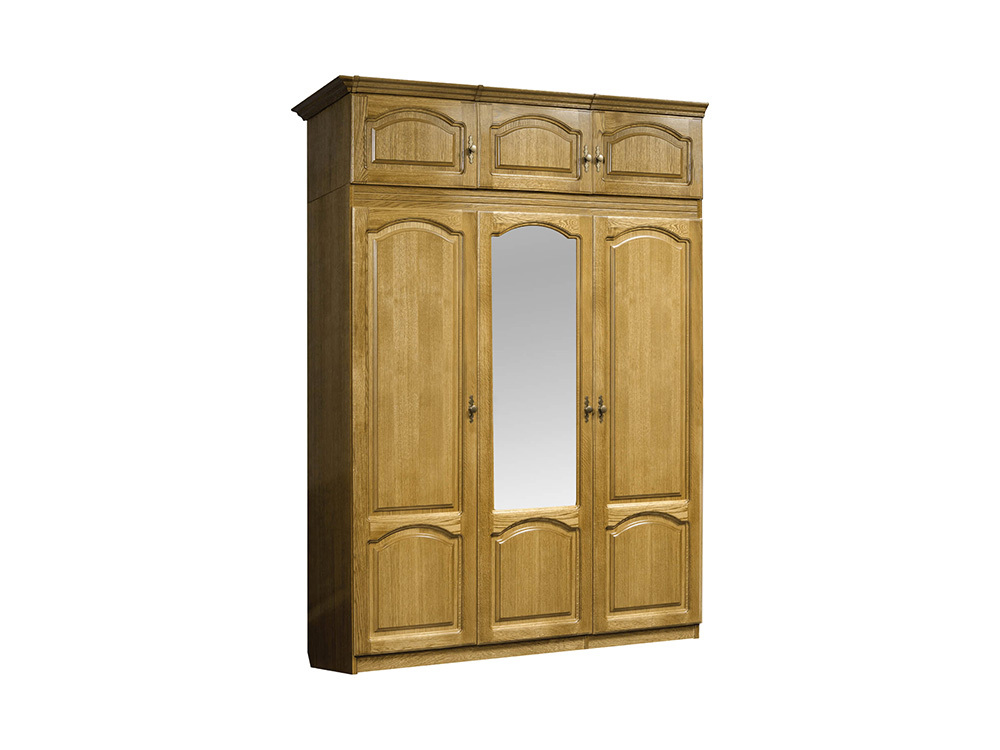 Трёхдверный шкаф для хранения одежды, с выдвижными ящиками, из коллекции мебели «САТИ». Каркас и фасады изготовлены из ЛДСП и МДФ. Опоры из массива. Крашение — «персидский жемчуг».