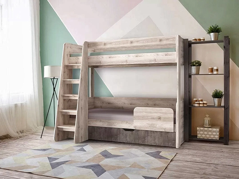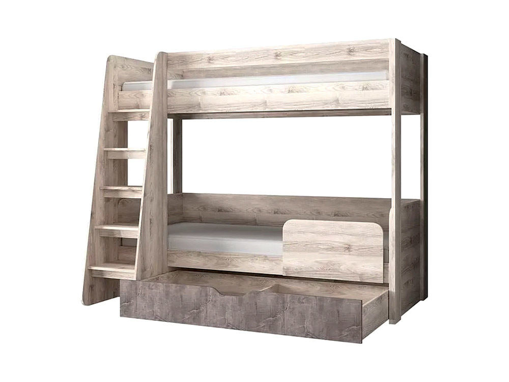 В комнатах с небольшой площадью обустроить уютные места для сна поможет двухъярусная кровать Джаз. Эта многофункциональная конструкция станет прекрасным решением для маленькой детской комнаты. Она поможет с комфортом отдыхать здесь двум детям разного возраста. Верхняя и нижняя кровати выдерживают нагрузку до 100 кг. Размер одного спального места составляет 90×200 см. Безопасность использования двухъярусной мебели обеспечивает лестница с широкими ступенями, закругленные углы и защитные бортики. Дополнительным бонусом станет наличие вместительного ящика, разделенного на 2 отделения. Это удобное решение для хранения пледов, подушек и одеял. Эффектное сочетание древесной структуры корпуса, цвета каштан найроби и серых вставок на ящике оттенка оникс придает конструкции подчеркнуто стильный вид. Двухъярусная кровать в такой нейтральной отделке подойдет для спальни девочки и мальчика, а также интерьеров современного стиля.