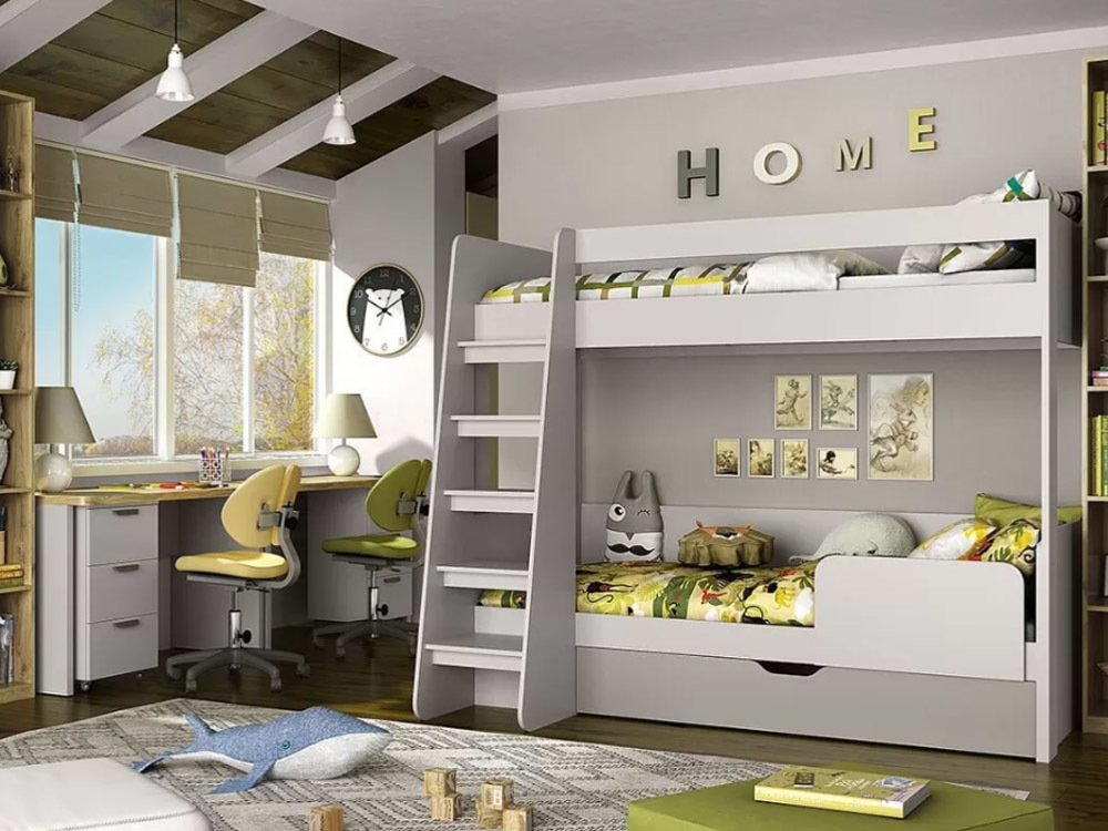 Двухъярусная кровать Модерн позволяет по-новому взглянуть на обустройство детской комнаты и отдых. При разработке этой модели белорусские дизайнеры учли возрастную физиологию и создали конструкцию со спальным местом шириной 135 см и длиной 208 см. В высоту она достигает 175 см, для безопасности подъема и спуска установлена устойчивая лестница с широкими ступенями. В производстве двухъярусной кровати Модерн использована ЛДСП класса экологичности Е1 и толщины 16 мм. Для безопасности вверху и внизу установлены защитные бортики. Внизу предусмотрен выдвижной ящик для спальных принадлежностей и белья. Для удобства его открывания сделаны специальные выемки. Модель представлена в оригинальной комбинации цветов персидский жемчуг и ирландский ликер. Визуально легкая отделка, неизбитый дизайн, простота в уходе – ключевые преимущества двухъярусной кровати Модерн. Ее торцы оклеены кромкой ПВХ, что предупреждает быстрый износ мебели и не позволяет содержащимся в материале клеевым составам испаряться. Модель такого размера и дизайна подходит для спален, оформленных в стиле лофт, минимализм, лофт и других современных стилей.