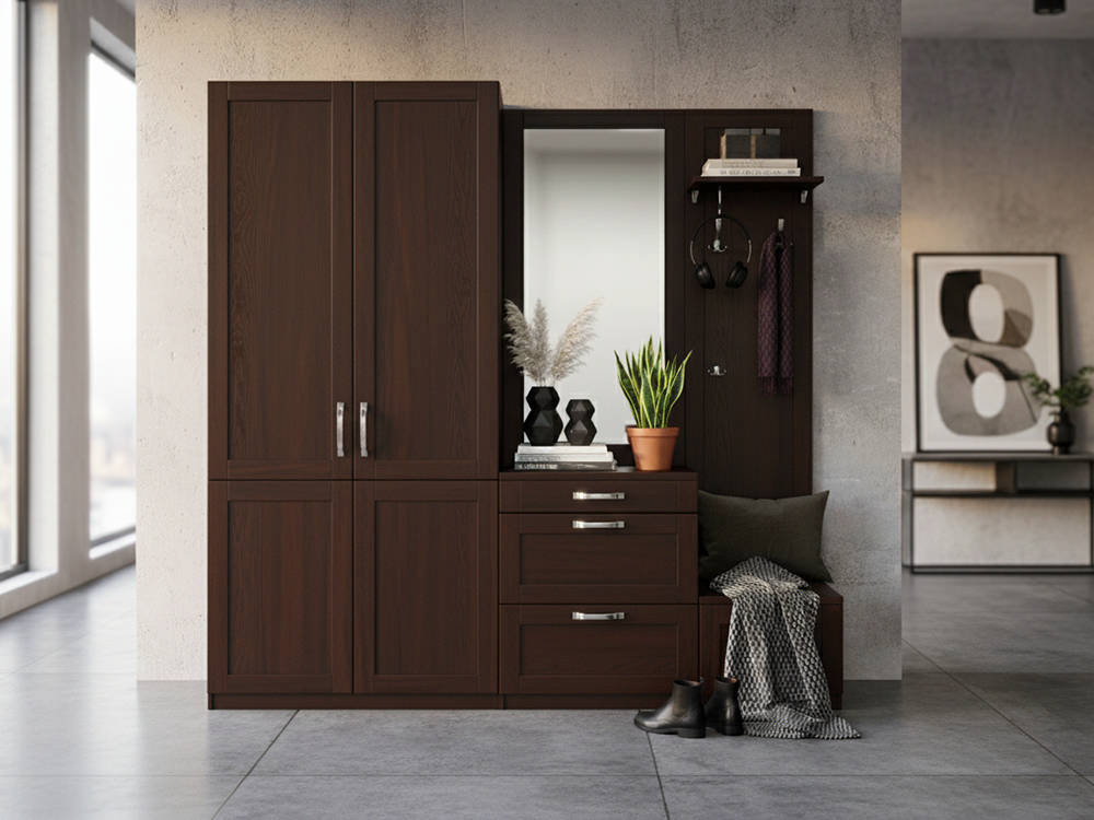Прихожая «Карина» — это стильное и функциональное решение для организации пространства входной зоны, сочетающее в себе качество материалов, продуманную конструкцию и современный дизайн. В составе: шкаф со штангами и полками, тумба для обуви, ящик для мелочей, ящик для обувных принадлежностей, зеркало, вешалки и полка для головных уборов.
