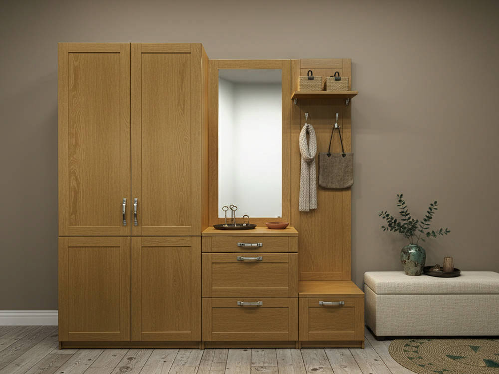 Прихожая «Карина» — это стильное и функциональное решение для организации пространства входной зоны, сочетающее в себе качество материалов, продуманную конструкцию и современный дизайн. В составе: шкаф со штангами и полками, тумба для обуви, ящик для мелочей, ящик для обувных принадлежностей, зеркало, вешалки и полка для головных уборов.