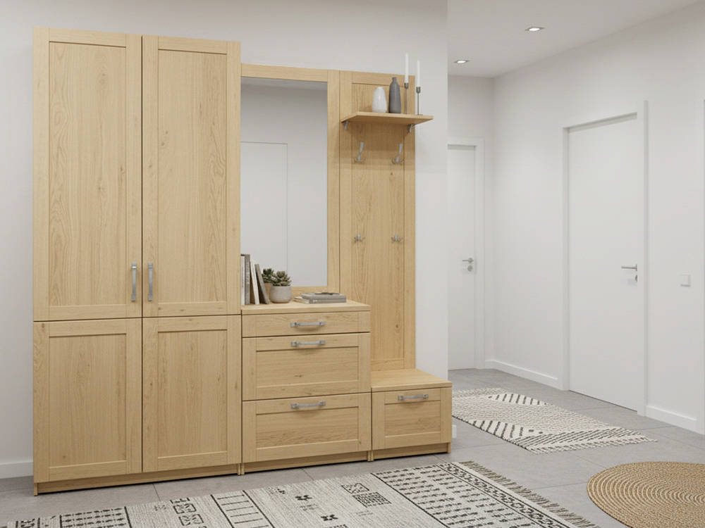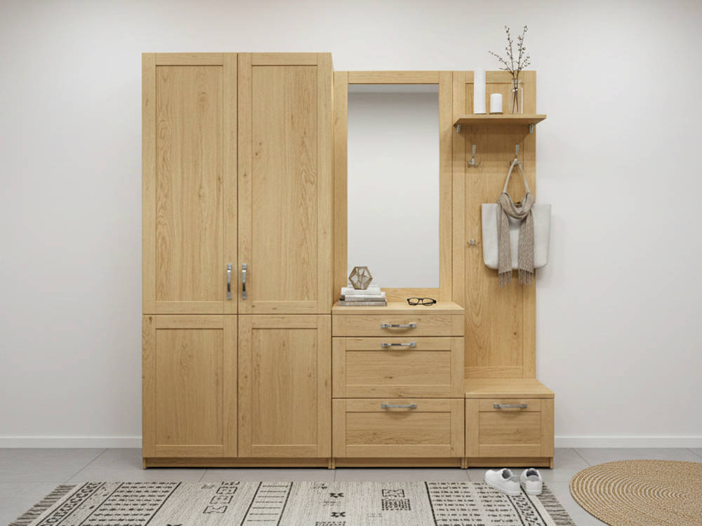 Прихожая «Карина» — это стильное и функциональное решение для организации пространства входной зоны, сочетающее в себе качество материалов, продуманную конструкцию и современный дизайн. В составе: шкаф со штангами и полками, тумба для обуви, ящик для мелочей, ящик для обувных принадлежностей, зеркало, вешалки и полка для головных уборов.