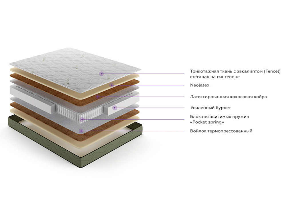Матрас сшит из уникальной ткани Tencel, содержащей эвкалиптовые волокна. Прочная, гладкая и эластичная, она обладает отличной воздухопроницаемостью и гигроскопичностью, что важно для создания оптимального микроклимата для сна. Это двухсторонний симметричный матрас из инновационной пены Neolatex, латексированной кокосовой койры и блока независимых пружин "Pocket spring". Neolatex идеально подстраивается под естественные изгибы позвоночника, равномерно распределяет нагрузку и снижает давление на мягкие ткани, суставы и кровеносные сосуды. Рекомендуется людям с чувствительной кожей и избыточным потоотделением.