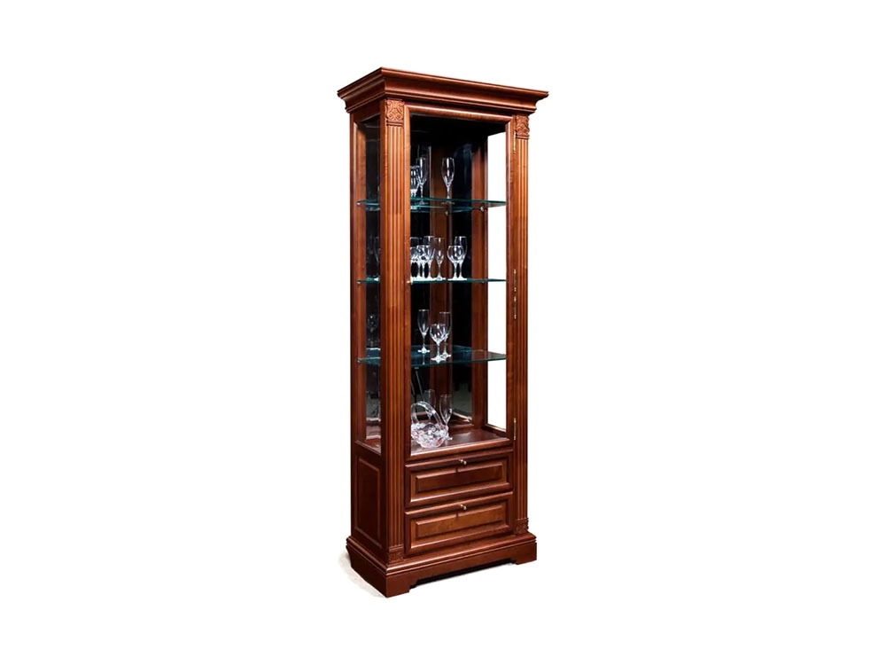 Шкаф с витриной, выполненный с использованием массива дерева, - элегантное решение для гостиной или домашнего кабинета в стиле нео-классицизм. Однодверная конструкция с правым открыванием оснащена стеклом и зеркальной задней стенкой с фацетом, создавая визуальный простор и подчёркивая содержимое. Качественная немецкая фурнитура Hafele и надежные направляющие Boyard обеспечивают долговечность и плавность эксплуатации. Натуральные материалы придают изделию прочность и стиль, гармонично дополняя интерьер уютом и изяществом.
