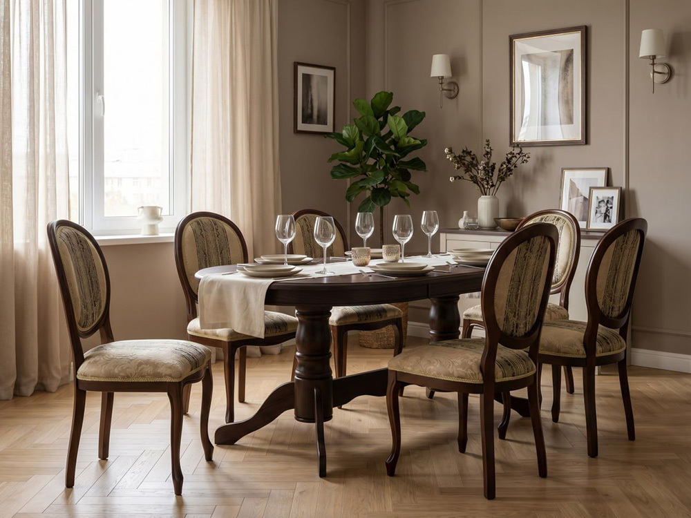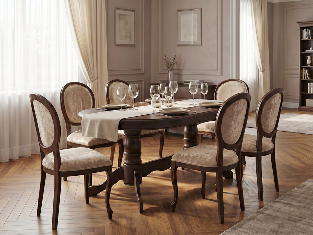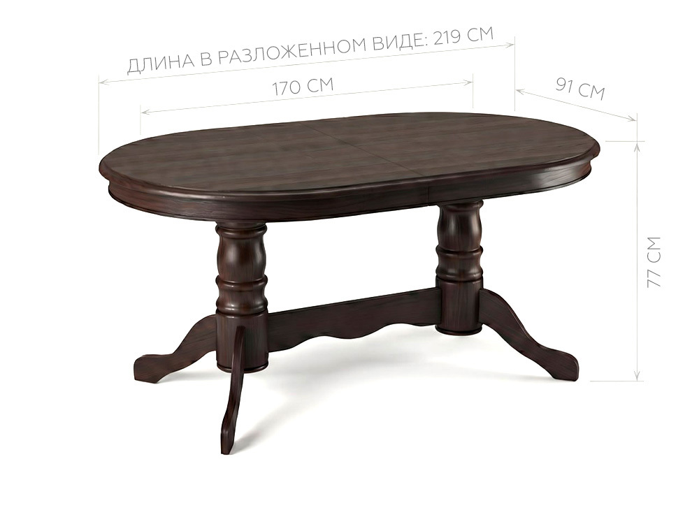Эта модель обеденного стола выполнена из качественных материалов. Стол ус- тойчивый и прочный. Выполненный в классическом стиле стол придаст интерьеру богатый и уютный вид. Он гармонично будет смотреться в просторном помещении, будь то классическая столовая или гостиная. Овальная столешница на мощных фигурных опорах ― воплощение надежности. Раздвижной механизм позволяет легко увеличить размеры стола. Благодаря этому вы можете с комфортом принимать гостей у себя дома. При использовании среднегабаритных стульев за этим столом смогут без стеснения расположиться 8 человек.