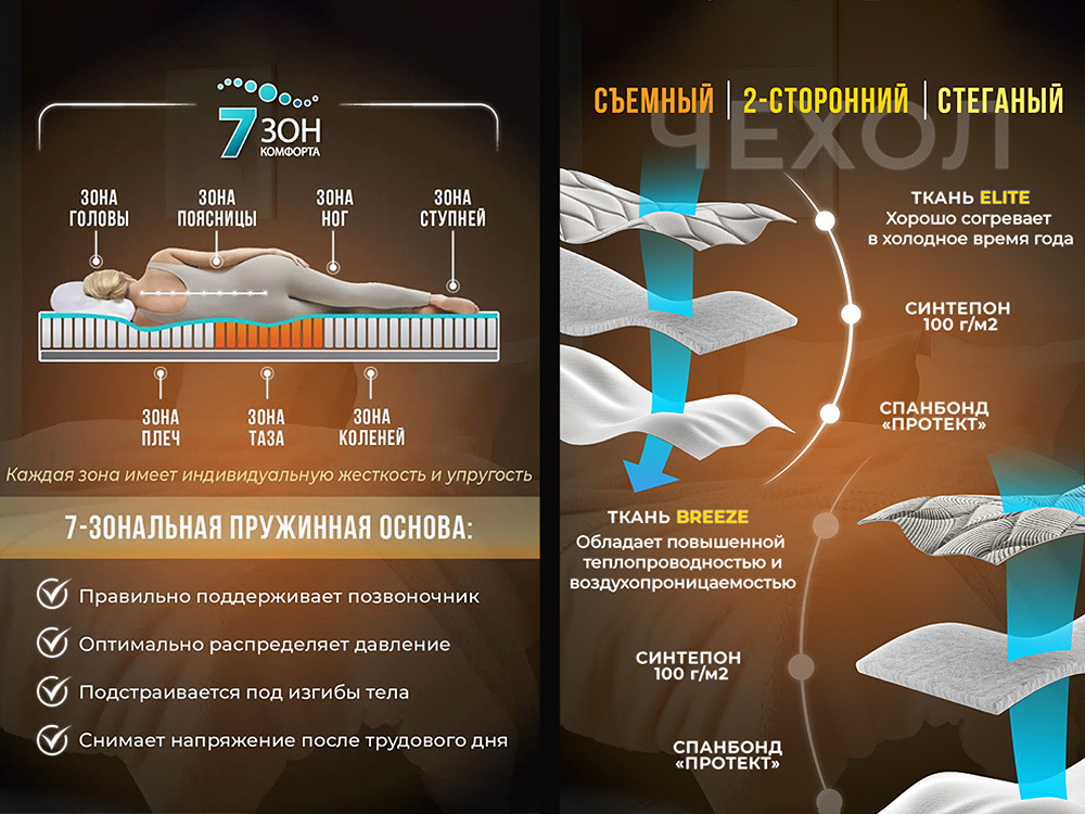 | Материал чехла: | микрофибра/полиэстер «зима‑лето», объёмная стёжка с антиаллергенным наполнителем, ППУ и спанбондом |